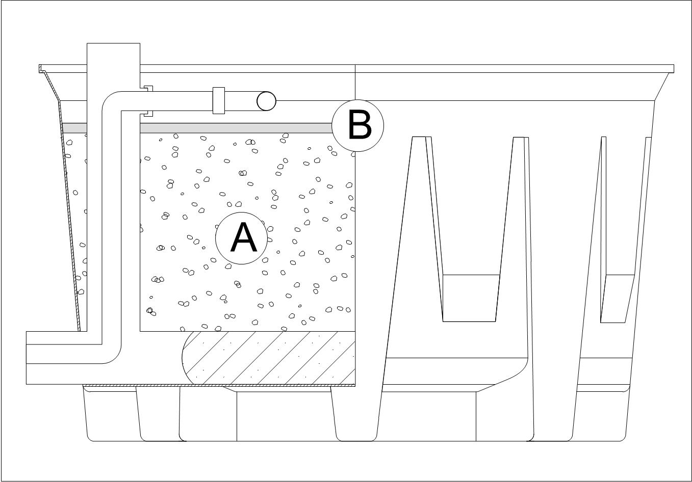 La etapa de ensuciamiento BioTopp VE complementa el sistema de planta de tratamiento de aguas residuales BioTopp (SBR), B2000 (sistema de flujo continuo) como módulo de expansión y, opcionalmente, también se puede utilizar en otros sistemas con estabilización de lodos activados. El producto del suelo de lodo es suelo de lodo seco, que también se puede utilizar como fertilizante para arbustos y jardines ornamentales. El contenido de la cuenca del suelo consiste en una capa de drenaje inferior y una capa superior de arena, sobre la cual también se pueden establecer plantas. Cuando se extrae el exceso de lodo, se carga una de las dos cámaras de la balsa de sedimentación. La filtración posterior conduce a la deshidratación del lodo. Se consigue una reducción adicional del volumen mediante la exposición al sol (formación de escamas del tamaño de la palma de la mano en la superficie de la piscina, espesor 3-5 mm). Además, la intemperie y la degradación biológica hacen que el lodo se higienice. Después de aproximadamente medio año (primavera-otoño) o un año (otoño a otoño), el suelo de lodo de depuradora seco se puede eliminar de la primera cámara.