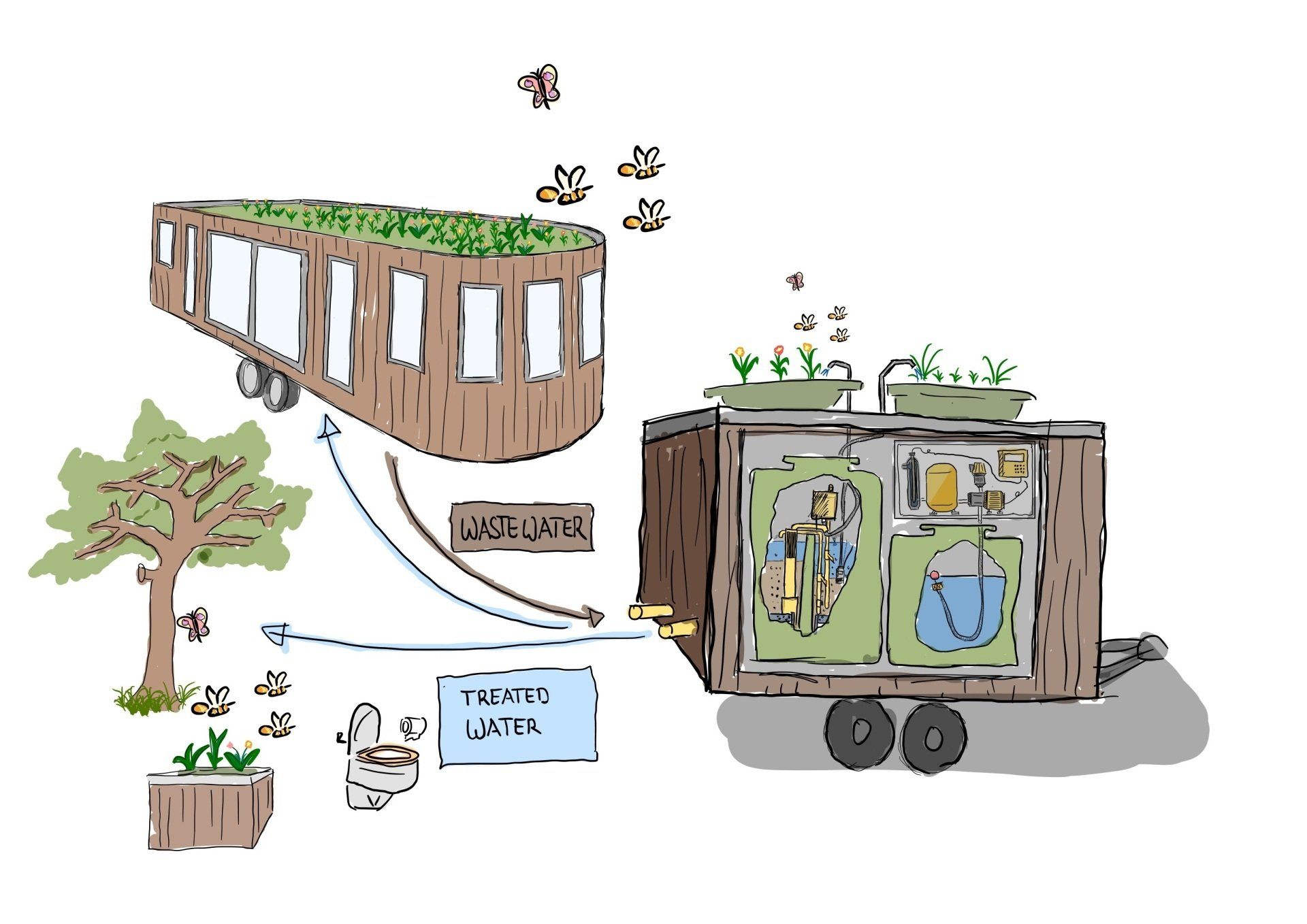 Nuestros sistemas de reutilización de agua también pueden ser fabricados como una solución de contenedor y personalizados por nuestro socio Tiny House Munufaktur.